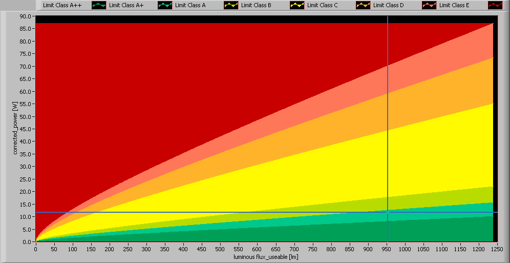 The lamp’s performance in the lumen-Watt field, with the energy efficacy fields indicated.