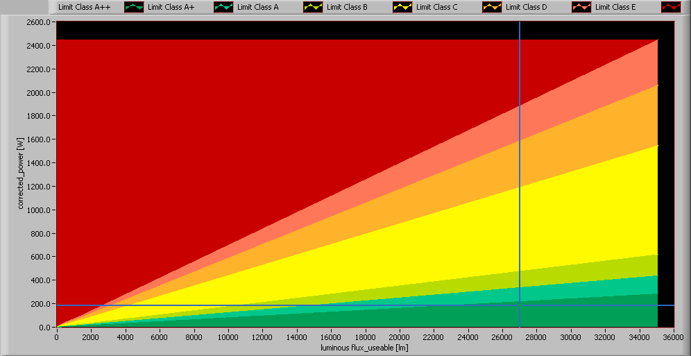 The lamp’s performance in the lumen-Watt field, with the energy efficacy fields indicated.