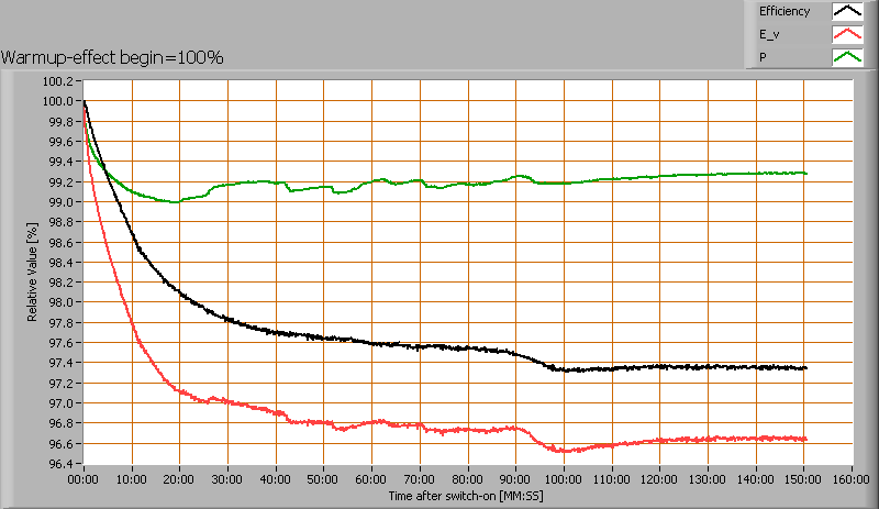 After switch on of a cold lamp, the effect of heating up of the lamp is measured on illuminance E_v [lx], the lamppower P [W] and the luminous efficacy [lm/W].