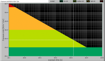 | Belichtungswert [W/m^2/sr] | 6.91E+2 | Blaues Lichtgefahr-Wert für diese Lampe, gemessen direkt unter der Lampe. Die Berechnung ist bezogen auf Lb. |