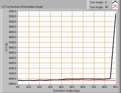 The color temperature is given for inclination angles up to 90 deg. Beyond that angle has not been measured.