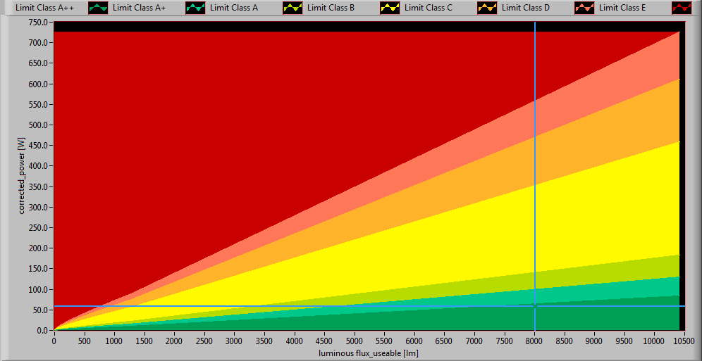 The lamp’s performance in the lumen-Watt field, with the energy efficacy fields indicated.