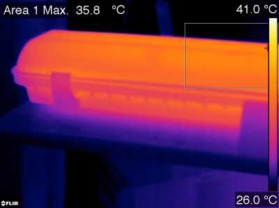 Warm up effect: During the warmup time the illuminance doesn’t vary significantly (< 5 %). During the warmup time the power doesn’t vary significantly (< 5 %). Voltage dependency: There is no (significant) dependency of the illuminance when the power voltage varies between 200 – 250 V AC. At the end of the article an additional photo. |