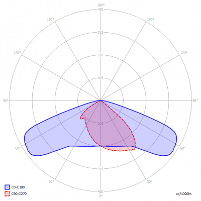 The light diagram indicates the beam in the C0-C180 plane (perpendicular to the length direction of the lamp) and in the plane perpendicular to that, the C90-C270 plane (along the length direction of the lamp).