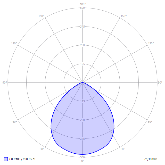 The light diagram indicates the beam in the C0-C180 plane and in the plane perpendicular to that, the C90-C270 plane. These beams are equal as the lamp has symmetry over its first axis (the vertical axis).