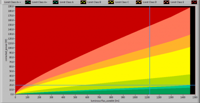 The lamp’s performance in the lumen-Watt field, with the energy efficacy fields indicated.