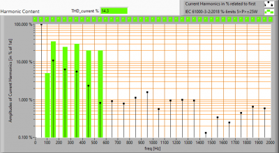 This current waveform has been checked on requirements posed by the norm IEC 61000-3-2:2018. This norm contains requirements for lamps with a power 5 W, 5 – 25 W and > 25 W. This lamp consumes 12.5 W.