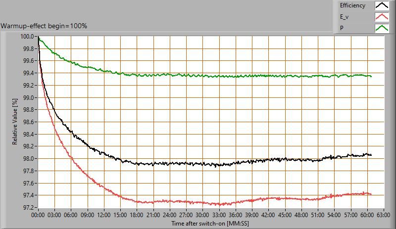 The variation in efficacy (calculated as indication by simply dividing the illuminance by the power) during the warming up is -2 %. A very high negative value indicates a significant decrease for instance due to heating up of the lamp (decrease of lifetime).