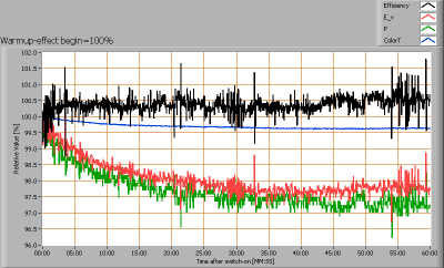 Van deze lamp zijn de opwarm-effecten doorgemeten op de verschillende interessante parameters. Zie ook de grafiek.