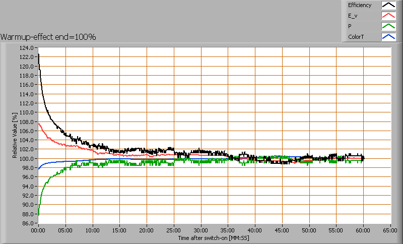 Bij het opwarmen geeft de ledlamp na een 15 tal minuten 6 % minder licht. Tevens neemt het vermogen toe met 12 %.