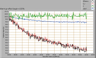 Van deze lamp zijn de opwarm-effecten doorgemeten op de verschillende interessante parameters. Zie ook de grafiek.