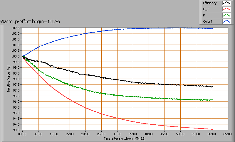 Van deze lamp zijn de opwarm-effecten doorgemeten op de verschillende interessante parameters. Zie ook de grafiek.