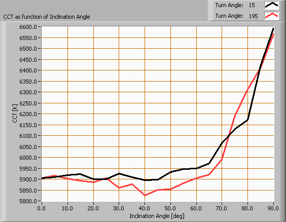 De kleurtemperatuur is gegeven voor kantelhoeken tot 90 graden, daarna is niet meer gemeten.