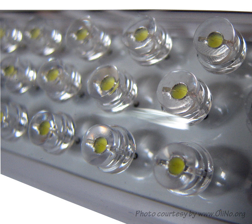 Opwarmeffect: gedurende de opwarming neemt de verlichtingssterkte met zo’n 10 % af en ook het opgenomen vermogen met 9 %. Spanningsafhankelijkheid: het opgenomen vermogen en de verlichtingssterkte zijn afhankelijk van de voedingsspanning van de lamp. Deze afhankelijkheid is lineair. Zie aan het einde van het artikel voor een close up van de leds. |