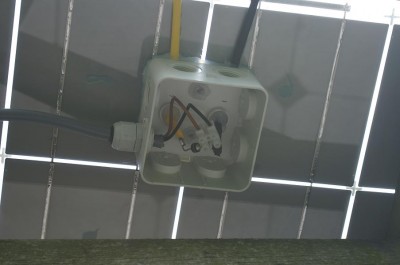 Aan de achterkant van het paneel plaatste ik een junction box met een kroonsteen blok. Aan één kant van het blok komt de + en – van het paneel in en aan de andere kant komt de kabel die naar de inverter gaat. In de junction box komt ook een diode tussen de + die van het paneel komt en de + die naar de inverter gaat, deze diode voorkomt dat er elektriciteit terug naar het paneel gaat wanneer het paneel niets produceert (zoals tijdens de avond uren).