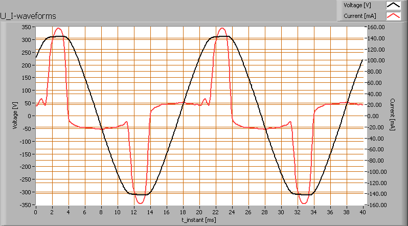 De stroom heeft geen sinusvorm, echter heeft pieken. De pieken zijn in fase met de spanningsvorm, echter er loopt een sinusvorm door de stroom heen (aan de basis van de pieken) die 90 graden voorloopt in fase. Het geheel is dus niet in fase en niet sinusvormig. Dit geheel resulteert in een lagere powerfactorwaarde.