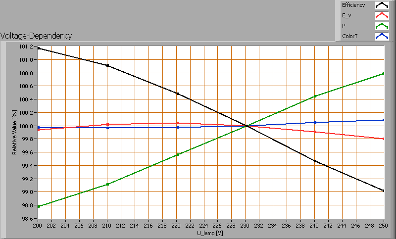 De lamp is onderzocht op hoe afhankelijk de parameters verlichtingssterkte E_v [lx], de kleurtemperatuur T [K] en het opgenomen netto vermogen P [W] zijn van de lampspanning.