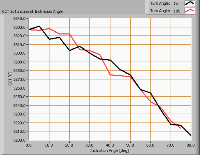 Kijkende naar de stralingshoek van 123 graden (dus 61.5 graden kantelhoek, dit is het gebied waar het meeste van het licht afgegeven wordt) dan geldt dat in dit gebied de kleurtemperatuur met ongeveer 3 % afneemt.