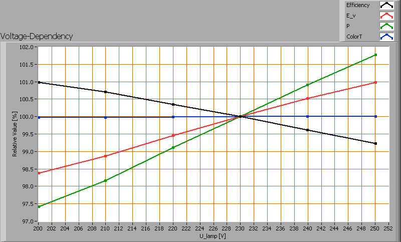 Afhankelijkheid van lampparameters van de ingestelde lampspanning.