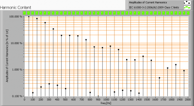 De harmonischen van de stroom uitgezet tegen de eisen voor harmonischen vanuit IEC61000-3-2:2006 A2:2009