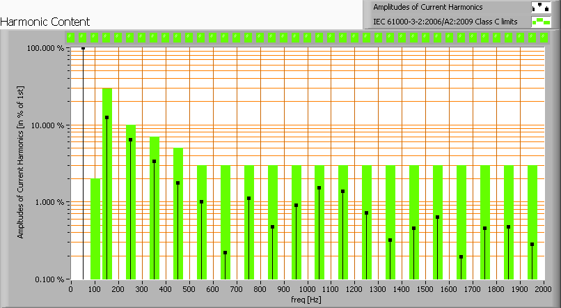 De harmonischen van de stroom uitgezet tegen de eisen voor harmonischen vanuit IEC61000-3-2:2006 A2:2009