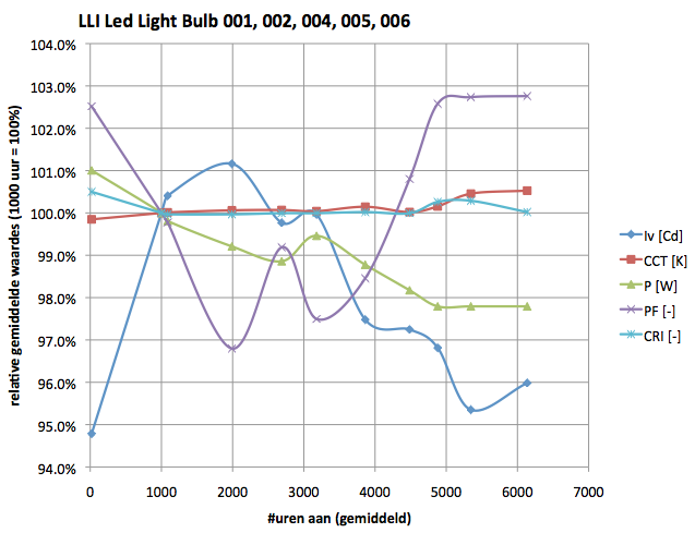 De kollommen in deze tabel bevatten de gemiddelde waardes van de 5 volledig geduurteste lampen (nrs 1, 2, 4, 5 en 6). Initieel wil zeggen aan het begin van de proef, dus 0 uur. Na test levensduur wil zeggen na 6000 uur branden.