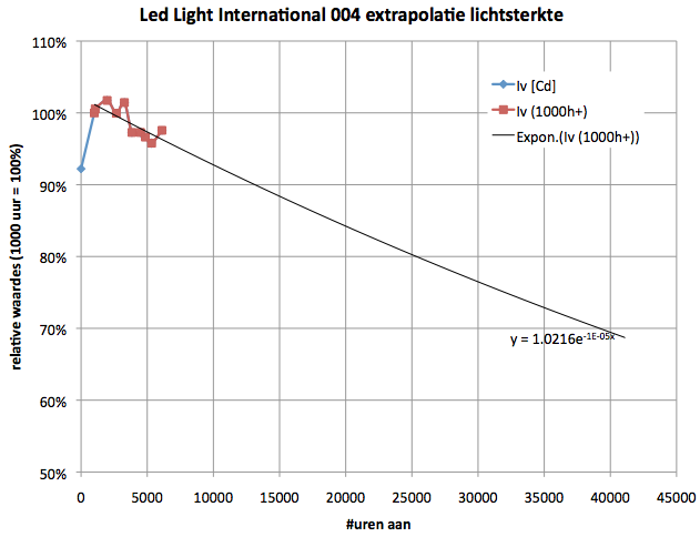 Er kan een extrapolatie gemaakt worden naar het 70 % verlichtingssterkteniveau, waarbij de verandering van verlichtingssterkte als directe maat wordt genomen voor de verandering van de totale lichtstroom. Dit klopt ook wel gezien dat de stralingshoek niet is veranderd gedurende de levensduurtest (de leds blijven op dezelfde manier rondom stralen).