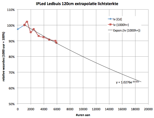 Er kan een extrapolatie gemaakt worden naar het 70 % verlichtingssterkteniveau, waarbij de verandering van verlichtingssterkte als directe maat wordt genomen voor de verandering van de totale lichtstroom. Dit klopt ook wel gezien dat de stralingshoek niet is veranderd gedurende de levensduurtest (de leds blijven op dezelfde manier rondom stralen).