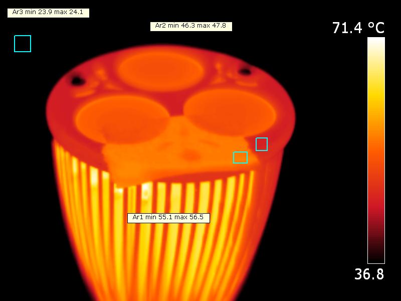 | Algemene opmerkingen | De omgevingstemperatuur gedurende de hele set van metingen was 25.5-26.5 deg C. De lamp wordt tussen de koelvinnen aan de buitenkant ongeveer 40 graden warmer dan omgevingstemperatuur.