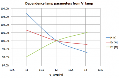 De lampparameters variëren niet noemenswaardig mee met de variatie van de aangelegde voedingsspanning, wanneer de voedingsspanning varieert tussen de 11-13 V.