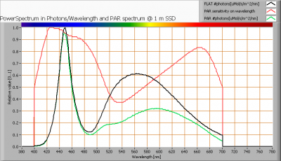 Het fotonenspectrum, dan de gevoeligheidscurve, resulterend in een PAR-spectrum