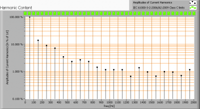 De harmonischen van de stroom uitgezet tegen de eisen voor harmonischen vanuit IEC61000-3-2:2006 A2:2009