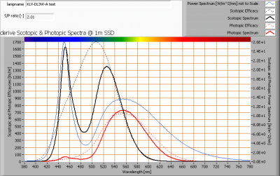 Het vermogensspectrum, de gevoeligheidscurves en de resulterende nacht – en dagspectra (laatste op 1 m afstand).