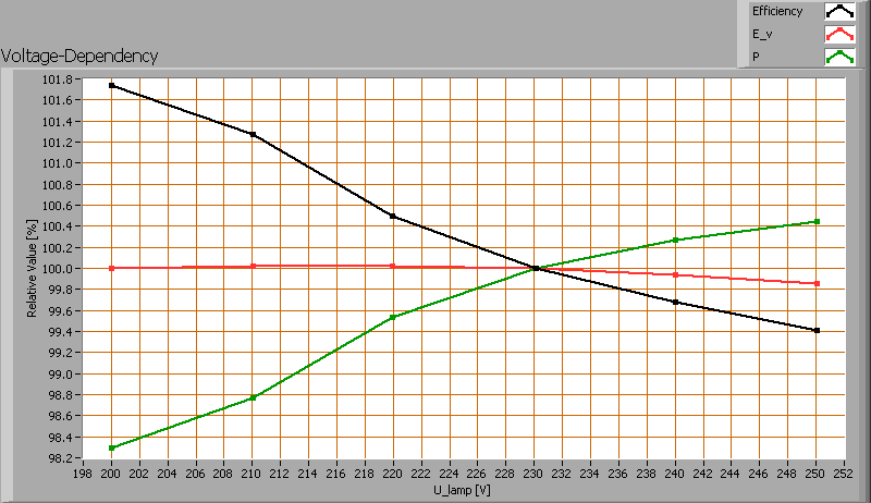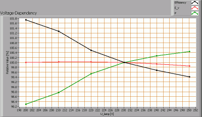 De lamp is onderzocht op hoe afhankelijk de parameters verlichtingssterkte E_v [lx] en het opgenomen netto vermogen P [W] zijn van de lampspanning. Uit de deling van E_v door P volgt een inschatting van de efficiëntie.