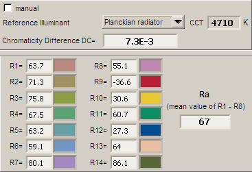 Deze waarde van 67 is kleiner dan de waarde van 80 die als minimum geldt voor een natuurgetrouwe kleurweergave voor alledaags gebruik, zie ook de uitleg op OliNo.