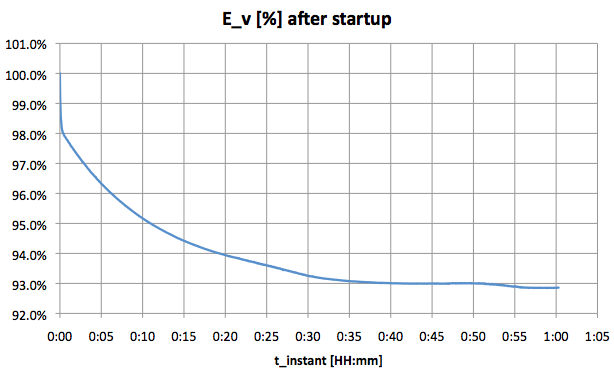 De warmup tijd is ongeveer 35 minuten, in die tijd neemt de verlichtingssterkte af met ongeveer 7 %. Het opgenomen vermogen is niet noemenswaardig veranderd (apart gemeten).