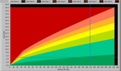 Met de meting van de lichtstroom en het opgenomen vermogen is de klassificatie te geven van deze lamp. Dit wordt voor een aantal lampen verplicht gesteld in de EU, zie ook de OliNo site waar uitleg staat voor welke lampen het geldt, hoe het label eruit ziet en wat het moet bevatten aan informatie.