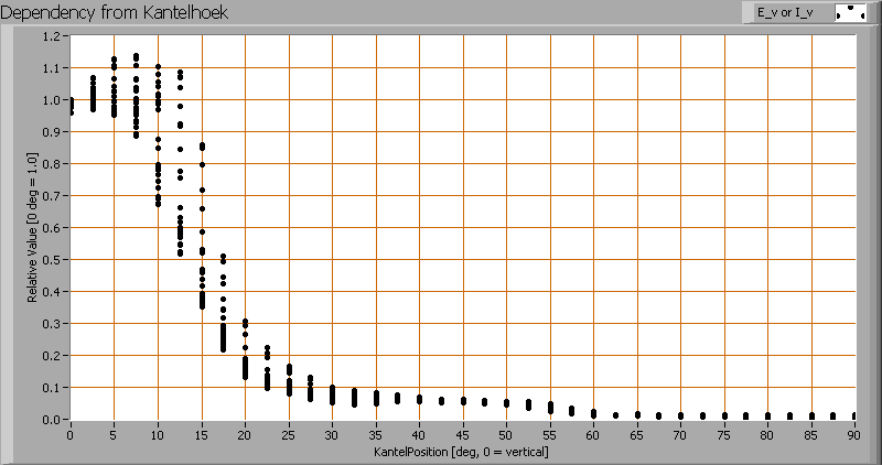 Deze plot geeft grafisch weer welke verschillende meetwaardes verkregen zijn bij iedere kantelhoek. Voor een bepaalde kantelhoek zijn er zo een aantal metingen, die afkomstig zijn van verschillende draaihoeken rondom de lamp.