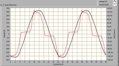 Tevens is van deze lamp de spanningsvorm en stroomvorm opgenomen. Hoe de spannings- en stroomvorm wordt gemeten wordt uitgelegd op de OliNo site.