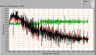 Van deze lamp zijn de opwarm-effecten doorgemeten op de verschillende interessante parameters. Zie ook de grafiek.