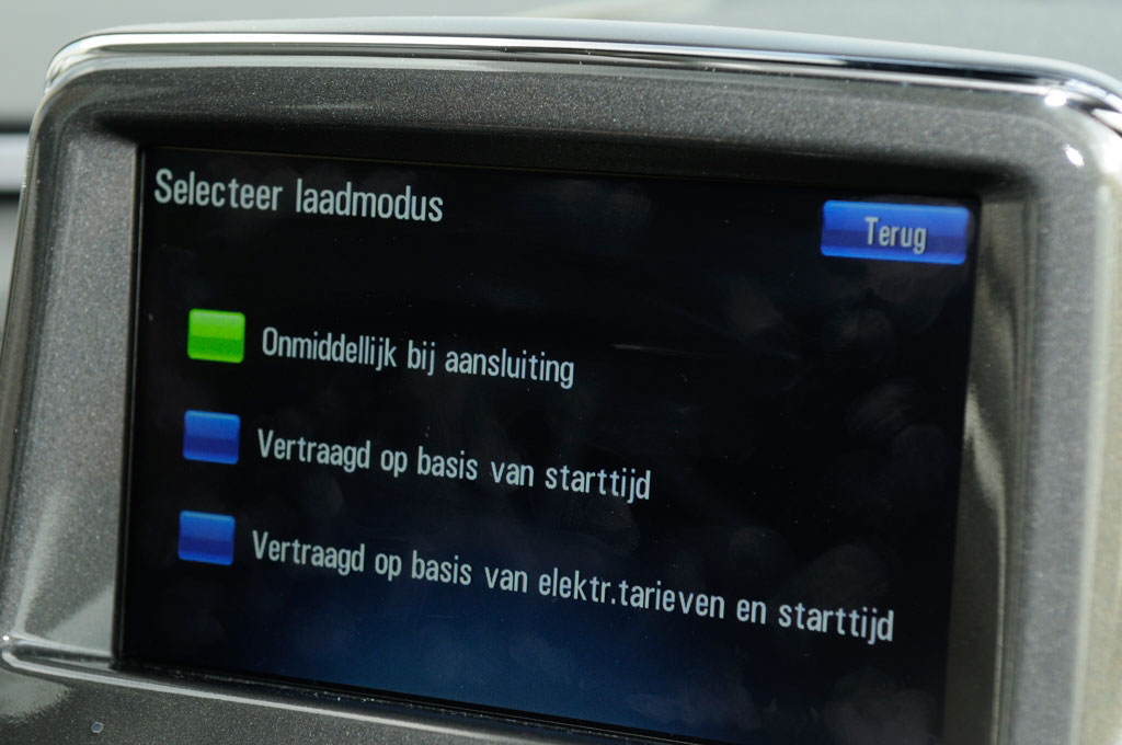 Thuis heb ik de Ampera aangesloten op het stopcontact in mijn garage. De auto meldt keurig hoe laat hij volledig opgeladen zal zijn. Bij lege accu duurt dit ongeveer 6 uur. Desgewenst kan je kiezen om het opladen op een ander tijdstip plaats te laten vinden.