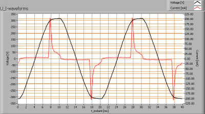 Tevens is van deze lamp de spanningsvorm en stroomvorm opgenomen. Hoe de spannings- en stroomvorm wordt gemeten wordt uitgelegd op de OliNo site.