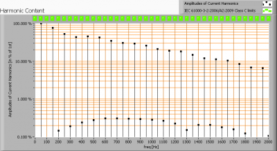 De harmonischen van de stroom uitgezet tegen de eisen voor harmonischen vanuit IEC61000-3-2:2006 A2:2009