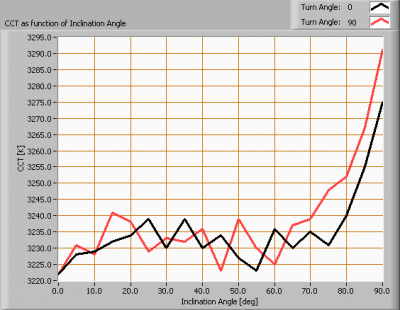 Voor het C0-C180 vlak: kijkende naar de stralingshoek van 164 graden dan komt dit overeen met 82.1 graden kantelhoek, dit is het gebied waar het meeste van het licht afgegeven wordt. De maximale variatie in kleurtemperatuur in de eerste 90 graden van dit gebied (kantelhoek) is ongeveer 1 %.