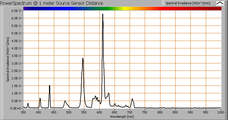 Het kleurspectrum van het licht van deze lamp. Energieniveaus geldig op 1 m afstand.