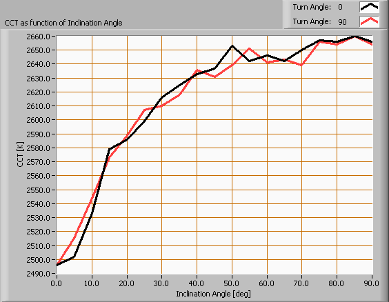 Voor het C0-C180 vlak: kijkende naar de stralingshoek van 330 graden dan komt dit overeen met 165.2 graden kantelhoek, dit is het gebied waar het meeste van het licht afgegeven wordt. De maximale variatie in kleurtemperatuur in de eerste 90 graden van dit gebied (kantelhoek) is ongeveer 7 %.