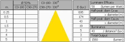 Een lichtstroom van 1560 lm, en een opgenomen vermogen van 27.0 Watt, levert een efficiëntie van 58 lm/Watt.