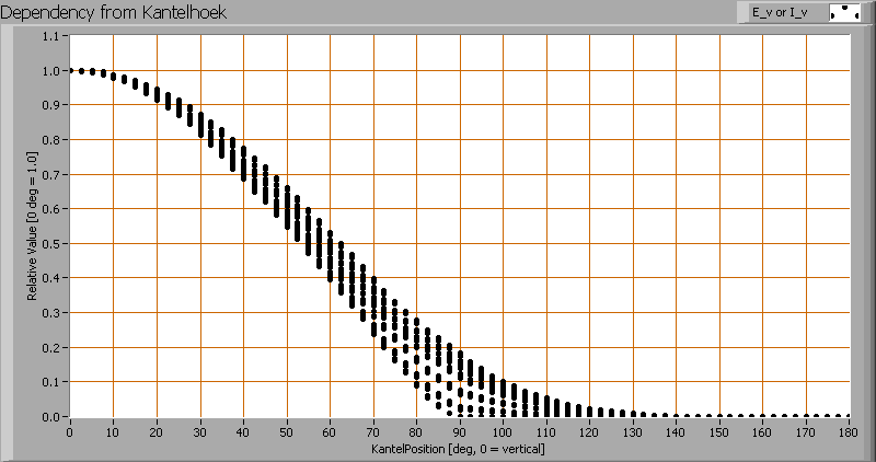 Deze plot geeft grafisch weer welke verschillende meetwaarden verkregen zijn bij iedere kantelhoek. Voor een bepaalde kantelhoek zijn er zo een aantal metingen, die afkomstig zijn van verschillende draaihoeken rondom de lamp.