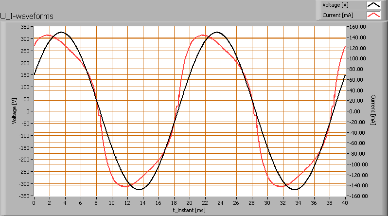 Tevens is van deze lamp de spanningsvorm en stroomvorm opgenomen. Hoe de spannings- en stroomvorm wordt gemeten wordt uitgelegd op de OliNo site.