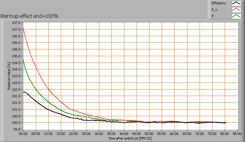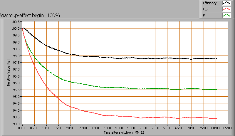 Van deze lamp zijn de opwarm-effecten doorgemeten op de verschillende interessante parameters. Zie ook de grafiek.